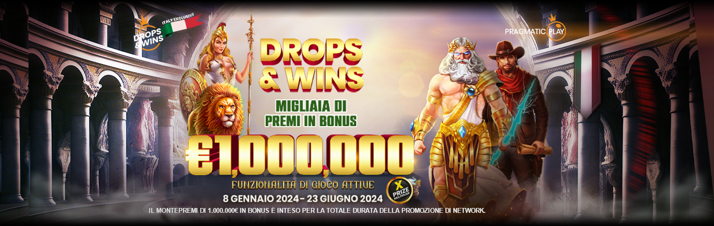 Drops & Wins €1.000.000 dall’8 gennaio 2024 al 23 giugno 2024 con Bonus Drop Settimanali e Tornei Giornalieri attivi ogni giorno dal Lunedì alla Domenica!
